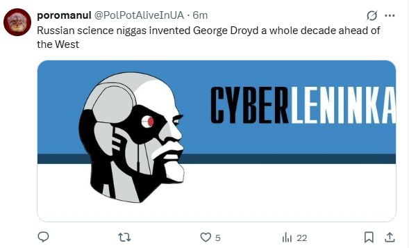 Мем представляет собой скриншот поста из социальной сети X (бывший Twitter). Пользователь с ником poromanul и изображением мохнатого существа на аватаре опубликовал пост: "Russian science niggas invented George Droyd a whole decade ahead of the West". Ниже расположен баннер с изображением головы Владимира Ленина, выполненной в футуристическом стиле, напоминающем робота или киборга, на синем фоне. У него характерная лысина и бородка, но механические детали видны на висках, подбородке и глазнице, где вместо глаза красный оптический сенсор. Рядом с головой Ленина написано крупными буквами "CYBERLENINKA". Пользователь сравнивает этого кибер-Ленина с Джорджем Дроидом (George Droyd), утверждая, что российская наука опередила Запад на десятилетие.
