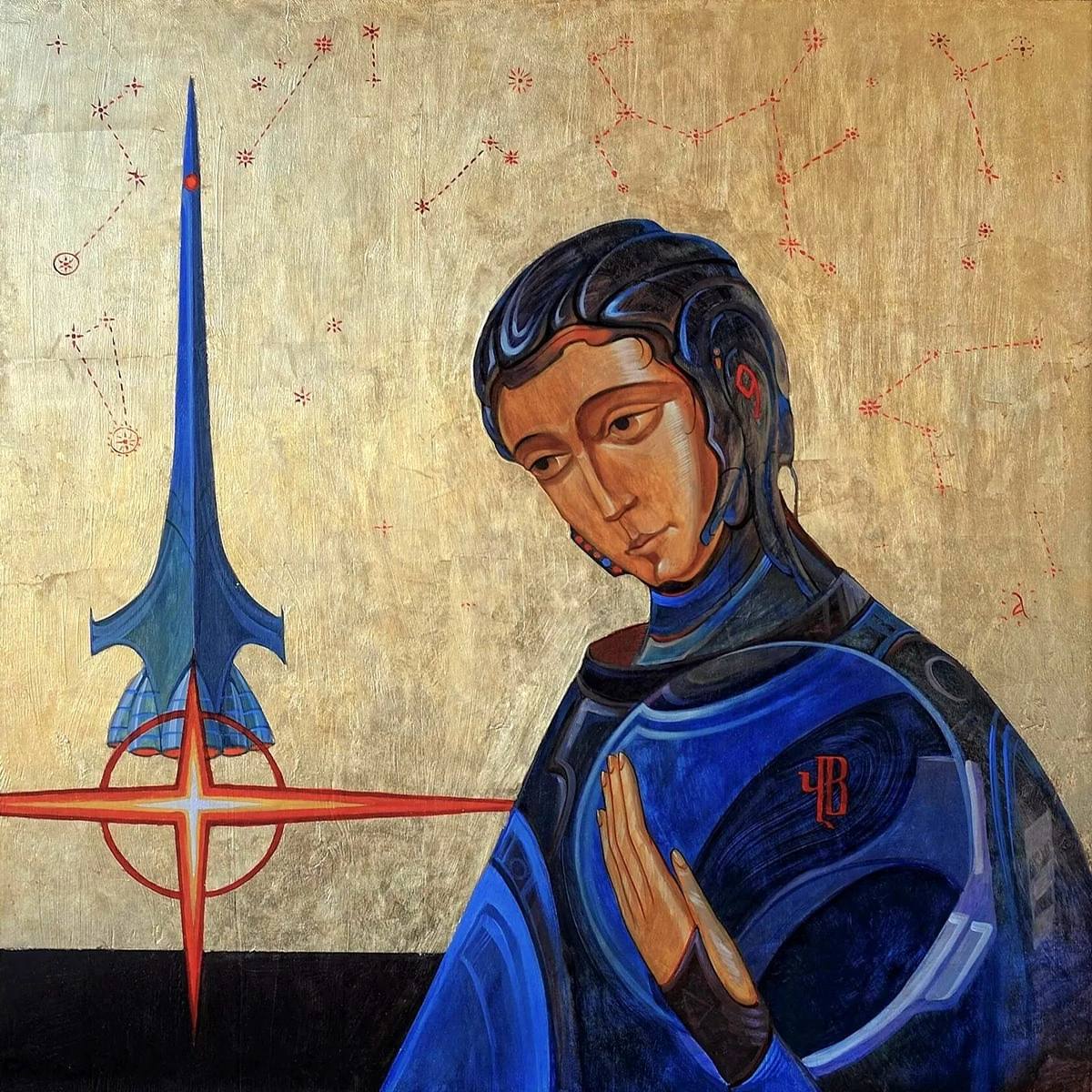 На изображении представлена стилизованная икона, выполненная в золотых, синих и красных тонах, с элементами киберпанка или футуризма. В центре композиции находится фигура, напоминающая религиозный образ святого или девы Марии, но с заметными технологическими модификациями: на голове виден шлем или имплантаты, а одежда стилизована под элементы киберкостюма. Ее лицо выражает задумчивость или смирение, взгляд направлен вниз. Слева от фигуры изображена вертикально ориентированная ракета или космический корабль, выполненный в синих тонах, с красным крестообразным символом у основания. Золотой фон иконы усеян красными пунктирными линиями, соединяющими небольшие звездочки или другие небесные тела, создавая впечатление карты звездного неба или космических траекторий. В целом, это произведение искусства сочетает традиционную иконографию с современной футуристической эстетикой, предлагая уникальное видение будущего или альтернативной реальности, где вера и технологии переплетаются.