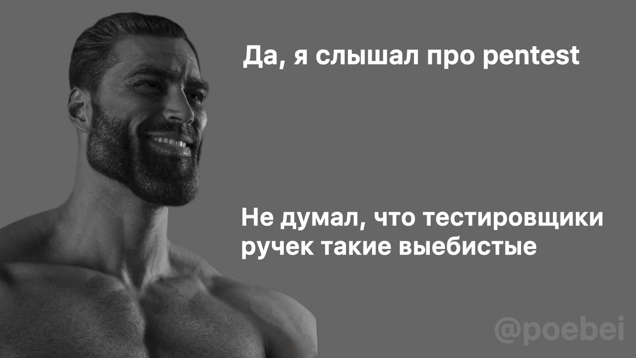 Мем изображает мужчину с массивным телосложением, с бородой и короткой стрижкой, который смотрит на зрителя и улыбается. Мужчина изображен в черно-белом цвете на сером фоне. Справа от него нарисованы две надписи, которые говорят, что он слышал про пентест и не думал, что "тестировщики ручек" такие выебистые. Пентест (penetration test) — это тестирование на проникновение, метод оценки безопасности компьютерных систем или сетей путём моделирования атаки злоумышленника. "Тестировщики ручек" — это игра слов, где "пентестеры" превращаются в тех, кто тестирует ручки, так как "пен" по-английски означает "ручка". Мужчина на изображении демонстрирует уверенность, а его слова создают комический эффект благодаря игре слов, показывающей непонимание истинного значения термина. Мем высмеивает тех, кто слышал о модных IT-терминах, но не до конца понимает их смысл, при этом делая это с видом знатока.