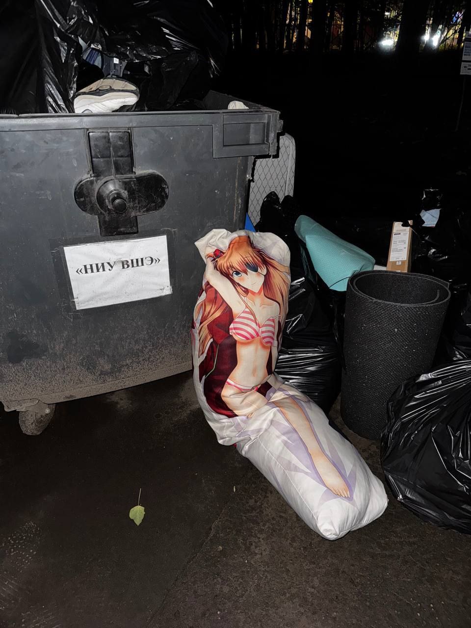 Дакимакура Аска у мусорки с надписью НИУ ВШЭ