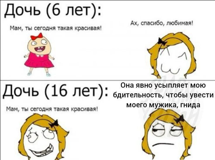 Дочь (6 лет): Мам, ты сегодня такая красивая! Ах, спасибо, любимая! Дочь (16 лет): Мам, ты сегодня такая красивая! Она явно усыпляет мою бдительность, чтобы увести моего мужика, гнида