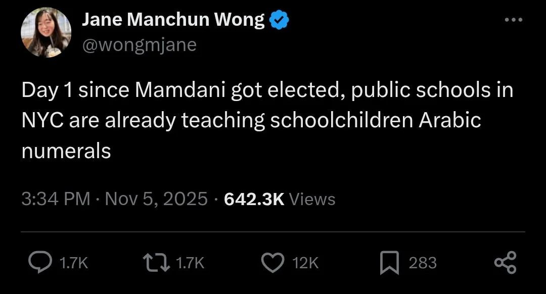 Day 1 since Mamdani got elected, public schools in NYC are already teaching schoolchildren Arabic numerals. 3:34 PM Nov 5, 2025. 642.3K Views.