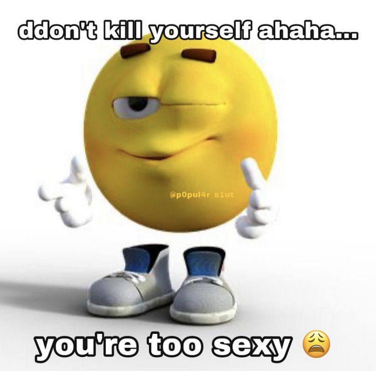 На изображении представлен желтый смайлик с самоуверенным выражением лица, подмигивающий одним глазом и показывающий жест одобрения обеими руками, как будто "отлично". Смайлик обут в серые кроссовки с синими вставками, что придает ему мультяшный вид. В верхней части изображения размещен текст "ddon't kill yourself ahaha...", а в нижней части, под смайликом, — "you're too sexy" и грустный эмодзи. Перевод текста: "не убивай себя ахаха... ты слишком сексуален". В центре смайлика виден небольшой текст "@p0pul4r_slut".