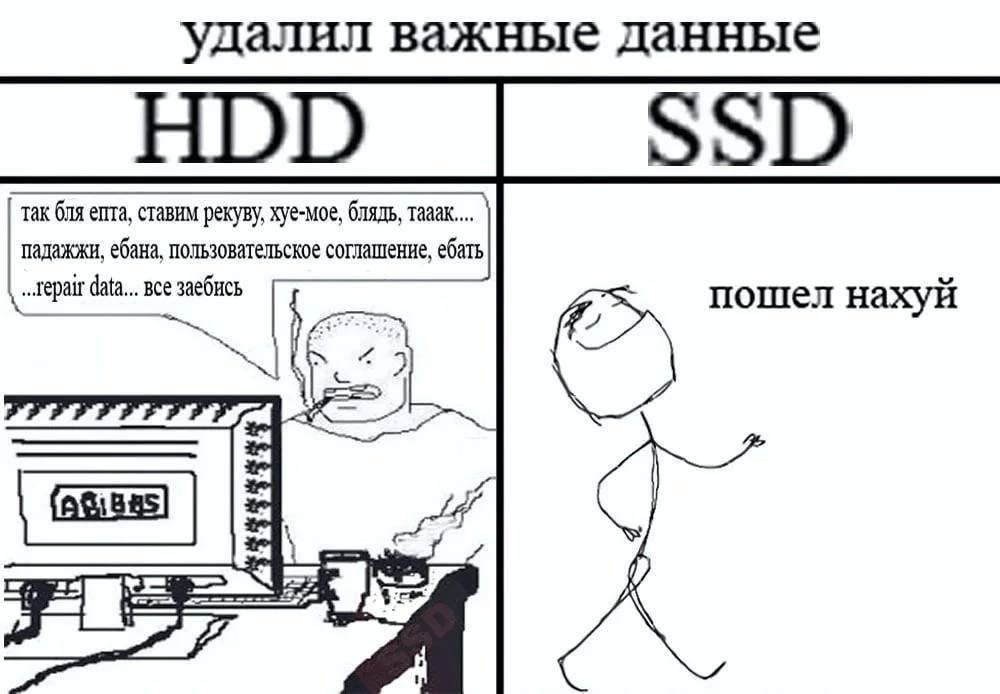 Мем разделён на две части, каждая из которых иллюстрирует реакцию на удаление важных данных с разных типов накопителей: HDD (жёсткий диск) и SSD (твердотельный накопитель). В левой части, под заголовком "HDD", изображён лысый мужчина с сигаретой во рту, сидящий за компьютером с надписью "ARIBAS" на мониторе. Он выглядит раздражённым и явно произносит длинную, эмоциональную фразу о попытке восстановления данных, которая включает в себя нецензурные слова, а также английскую фразу "repair data" (восстановить данные). В правой части, под заголовком "SSD", изображён простой стикмен, уходящий вдаль, с поднятой головой и говорящий "пошёл нахуй" (пошёл нахуй), что указывает на невозможность или бесполезность попыток восстановления данных с SSD. Мем наглядно демонстрирует широко известную проблему с восстановлением удалённых файлов с SSD, в отличие от HDD, где эта процедура часто бывает успешной. "Repair data... все заебись" (восстановить данные... всё заебись) – так звучит часть фразы персонажа, подчеркивая разницу в подходах и возможностях.