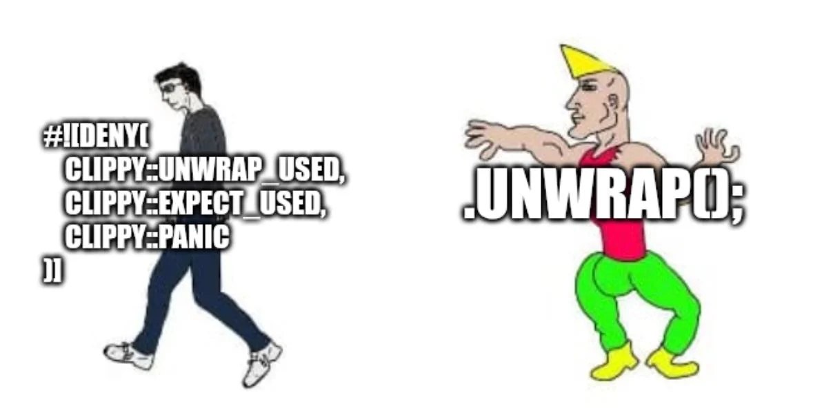 Мем изображает противопоставление двух типов программистов или подходов к программированию, используя популярных персонажей. Слева изображен "гигачад"-программист, который придерживается строгих правил и использует специальные директивы, запрещающие "unwrap" (разворачивание), "expect" (ожидание) и "panic" (панику) в коде. Это подчеркивает его педантичность и стремление к безопасным, безошибочным решениям. Справа изображен "настоящий программист", который смело использует "unwrap()", что может привести к панике, но он не боится рисковать. Это создает комический контраст между осторожностью и бравадой в мире разработки, отражая разницу в подходах к обработке ошибок.