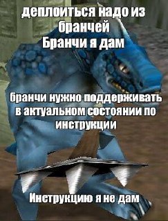 Мем изображает синего ящера, который стоит на двух лапах, с острыми шипами на одном из запястий, похожими на доспехи. На картинке присутствуют несколько надписей. Первая надпись гласит: "Деплоиться надо из бранчей. Бранчи я дам". Ниже расположены еще две надписи: "Бранчи нужно поддерживать в актуальном состоянии по инструкции" и "Инструкцию я не дам". Это создает комический эффект, так как персонаж сначала предлагает бранчи (ветки в разработке программного обеспечения), но затем отказывается предоставить инструкцию для их поддержания. Мем высмеивает ситуации, когда предоставляются ресурсы или задачи, но отсутствует необходимая поддержка или руководство.
