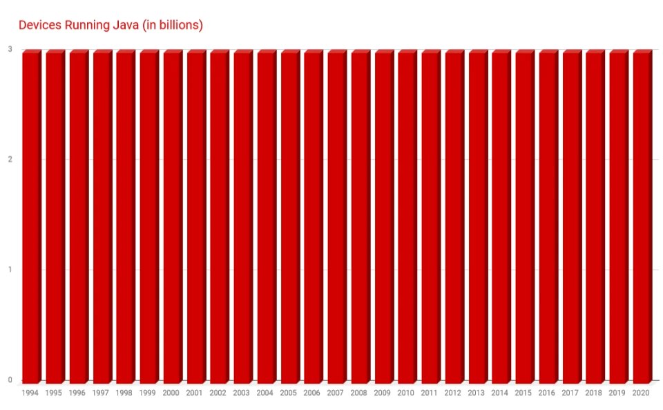 На изображении представлен столбчатый график, показывающий количество устройств, работающих на Java, в миллиардах, с 1994 по 2020 год. Все столбцы на графике абсолютно одинаковые и достигают отметки 3 миллиарда, что создает впечатление, будто количество устройств, использующих Java, остается неизменным на протяжении десятилетий, несмотря на явное развитие технологий. Это забавная иллюстрация стабильности или, возможно, преувеличения популярности Java. Над графиком красным цветом указан заголовок: "Устройства, работающие на Java (в миллиардах)".