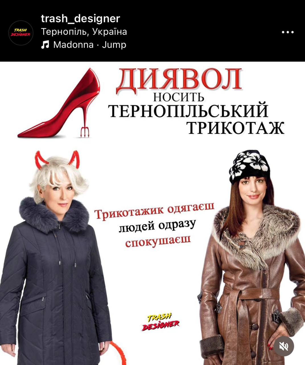 На изображении показана пародия на постер к фильму «Дьявол носит Prada». Вместо обуви на высоком каблуке и сумочки, на вершине постера изображена красная туфля, а под ней — красный ободок с рожками дьявола. Слева — актриса Мерил Стрип в роли Миранды Пристли, но с прифотошопленными красными рожками и в зимней куртке. Справа — Энн Хэтэуэй в роли Энди Сакс, но в коричневой дубленке и шапке. На фоне изображены рекламные материалы магазина одежды «Тернопольский трикотаж». Надписи на изображении гласят: «ДИЯВОЛ НОСИТЬ ТЕРНОПІЛЬСЬКИЙ ТРИКОТАЖ» и «Трикотажик одягаєш, людей одразу спокушаєш». Это означает «Дьявол носит тернопольский трикотаж» и «Надеваешь трикотаж, людей сразу соблазняешь».
