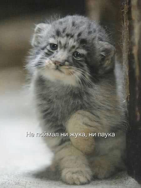На картинке изображен маленький манул, который выглядит очень грустным и расстроенным. У него пушистая серая шерсть с темными полосками, а его глаза кажутся наполненными слезами. Он сидит, прижавшись к чему-то похожему на деревянную стену или ствол дерева, его лапки сжаты перед собой. Внизу изображения находится надпись на русском языке: «Не поймал ни жука, ни паука». Это означает, что манул расстроен из-за неудачной охоты, не поймав ни жука, ни паука.