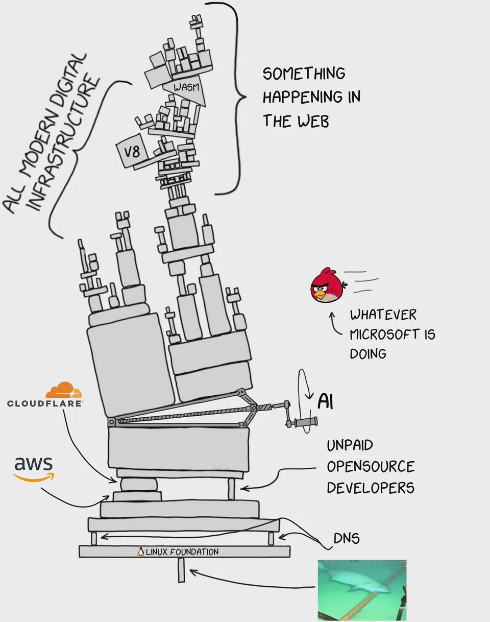 На изображении показана "вся современная цифровая инфраструктура" как громоздкая, неустойчивая конструкция, построенная из различных компонентов. Верхняя часть конструкции, обозначенная как "Something happening in the web" (Что-то происходит в интернете), включает в себя WASM и V8. В основании конструкции находится Linux Foundation, на котором "держится" все остальное. Сбоку от конструкции расположены стрелки, указывающие на различные элементы, влияющие на эту инфраструктуру: Cloudflare и AWS обозначены как крупные опоры, "Unpaid opensource developers" (Неоплачиваемые разработчики открытого исходного кода) изображены как шестеренка, вращающая рычаг, который "поддерживает" структуру. "Whatever Microsoft is doing" (Что бы там ни делал Microsoft) представлено в виде красной птички из Angry Birds, "AI" (ИИ) показан в виде еще одной шестеренки. В самом низу, под всем этим, находится акула, символизирующая DNS. Эта диаграмма показывает, насколько сложна и многослойна современная цифровая инфраструктура, и как много различных компонентов и сущностей влияют на ее стабильность и функционирование.