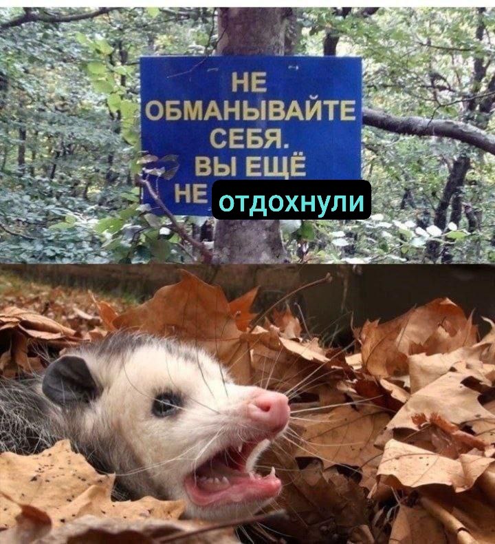 Мем состоит из двух частей: сверху изображена синяя табличка с надписью, прикрепленная к дереву, а снизу — опоссум, выглядывающий из кучи осенних листьев с широко открытой пастью. Надпись на табличке гласит: "Не обманывайте себя. Вы ещё не отдохнули". Выражение морды опоссума, который, кажется, кричит или зевает, идеально передаёт чувство усталости и недосыпа, соответствующее посланию таблички. Это изображение хорошо подходит для описания состояния, когда человек пытается убедить себя в том, что он отдохнул, но на самом деле чувствует себя разбитым и измождённым, как этот опоссум, "кричащий" о своей усталости. Мем отражает универсальное чувство недосыпа и потребности в полноценном отдыхе.