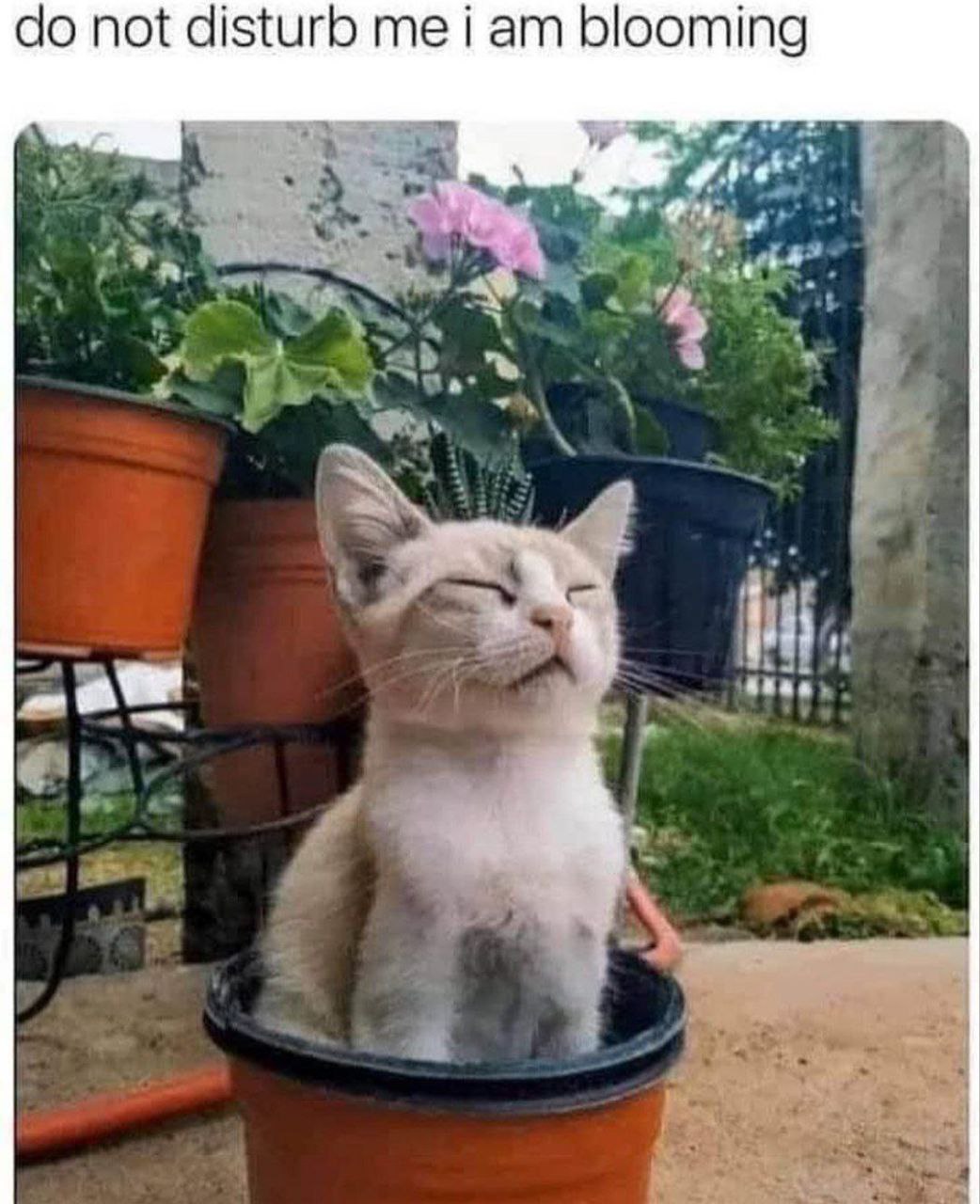 На изображении показан маленький белый котёнок с коричневыми пятнами, который сидит в оранжевом цветочном горшке. У котёнка закрыты глаза, и он слегка запрокинул голову, словно наслаждаясь моментом или солнечным светом. На заднем плане видны другие цветочные горшки с зелёными растениями и розовыми цветами, а также зелёная трава. Текст на картинке гласит: "Не беспокой меня, я расцветаю", что придаёт забавный и умиротворяющий смысл позе котёнка. Его поза и выражение мордочки вызывают улыбку и создают ощущение спокойствия и умиротворения, будто котёнок действительно наслаждается процессом "цветения" или просто дремлет, греясь на солнышке.