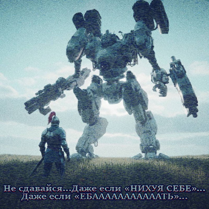 На изображении представлен кадр, напоминающий стилистику старых компьютерных игр или аниме. На переднем плане, спиной к зрителю, стоит одинокий рыцарь в полном облачении с красным плюмажем на шлеме и мечом у бедра. Он стоит на зеленом холме, поросшем травой, и смотрит на огромного боевого робота или меха, который возвышается над ним на горизонте. Робот значительно превосходит рыцаря по размеру, создавая впечатление невозможной битвы. Цветовая гамма изображения приглушенная, с доминированием синих и зеленых оттенков, а также эффектом зернистости, который придает изображению винтажный вид. Снизу подпись: «Не сдавайся... Даже если «НИХУЯ СЕБЕ»... Даже если «ЕБАААААААААТЬ»...» Это призыв не сдаваться даже перед лицом подавляющего превосходства или шокирующих обстоятельств.