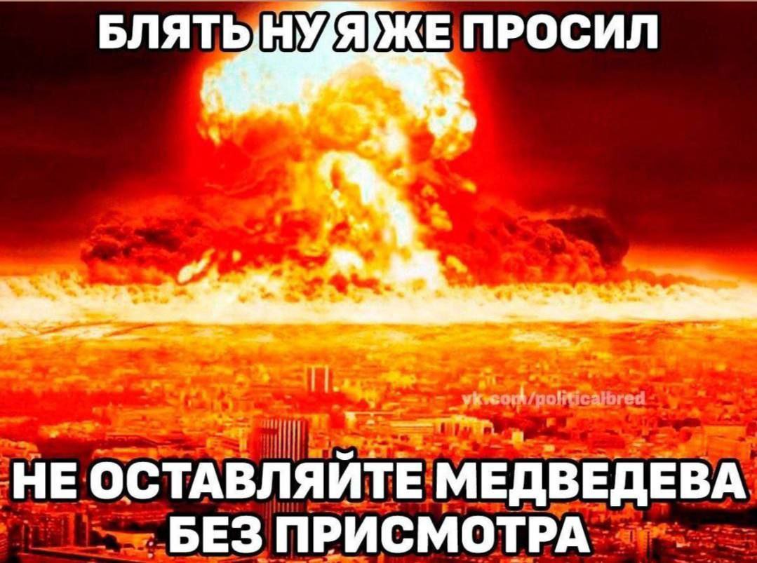 На изображении показан пейзаж, охваченный ярким огненным взрывом, напоминающим ядерный гриб, поднимающийся над городом. Все небо и горизонт окрашены в красный и оранжевый цвета, что создает устрашающую и драматичную атмосферу. Внизу видны очертания зданий, которые, вероятно, подверглись мощному удару. Вся сцена выглядит как катастрофа планетарного масштаба. Надпись на меме "БЛЯТЬ НУ Я ЖЕ ПРОСИЛ НЕ ОСТАВЛЯЙТЕ МЕДВЕДЕВА БЕЗ ПРИСМОТРА" переводится как "Блядь, ну я же просил не оставлять Медведева без присмотра", что добавляет юмористический, саркастический оттенок к апокалиптической картине, намекая на возможные последствия его действий без контроля.