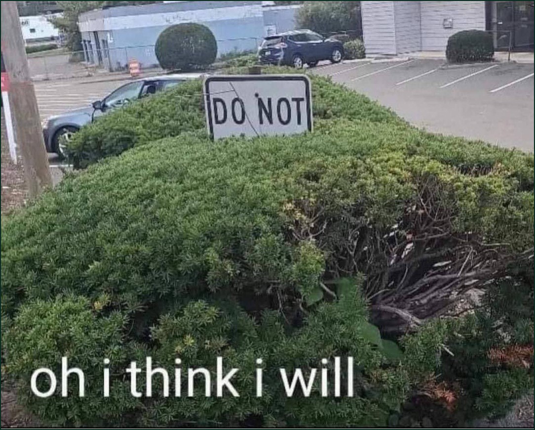 На изображении показан пышный зеленый куст, за которым виднеется парковка с машинами и зданиями на заднем плане. Посреди куста установлена белая табличка с черными буквами «DO NOT», что переводится как «НЕ НАДО» или «НЕ ДЕЛАЙТЕ». Ниже куста, в нижней части изображения, крупным белым шрифтом добавлена надпись: «oh i think i will», что означает «о, я думаю, что сделаю». Эта фраза является комическим ответом на запрещающий знак. Мем выражает неповиновение или игнорирование запретов, демонстрируя юмористическую реакцию на ограничения. Он часто используется для иллюстрации ситуаций, когда кто-то намеренно делает то, что ему запрещено, или просто забавно реагирует на знаки или правила.