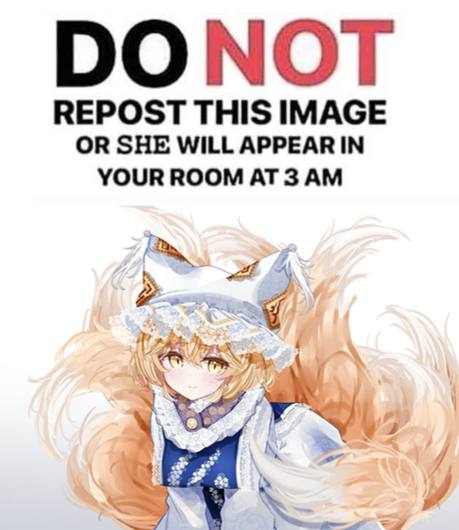 На изображении представлен мем с надписью «DO NOT REPOST THIS IMAGE OR SHE WILL APPEAR IN YOUR ROOM AT 3 AM». В переводе на русский это означает: «НЕ РЕПОСТИТЕ ЭТО ИЗОБРАЖЕНИЕ, ИНАЧЕ ОНА ПОЯВИТСЯ В ВАШЕЙ КОМНАТЕ В 3 УТРА». В нижней части изображения находится иллюстрация персонажа аниме или манги, напоминающего кицунэ или другого духа-лису, с пышными золотисто-рыжими хвостами и волосами, одетого в сине-белый наряд с кружевами и необычной шляпой. Надпись предупреждает пользователей о возможных последствиях репоста изображения в социальных сетях, создавая мистический и юмористический эффект. Мем, вероятно, используется для создания ажиотажа, привлечения внимания или просто как забавная угроза в интернете. Он играет на популярности персонажей аниме и мистических сюжетов, призывая не репостить картинку, чтобы избежать ночного визита загадочной девушки с лисьими хвостами.
