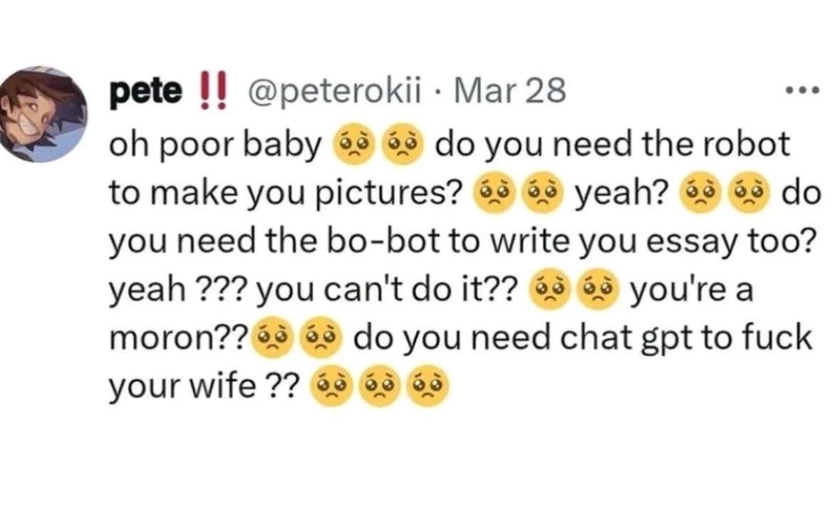 Мем представляет собой скриншот публикации пользователя с ником Pete в Twitter. На белом фоне поста виден круглый аватар пользователя, на котором изображено стилизованное лицо, похожее на аниме-персонажа, с выражением сарказма или издёвки. Текст публикации начинается с фразы «Oh poor baby» (Ох, бедняжка) и далее высмеивает людей, которые полагаются на искусственный интеллект для выполнения различных задач. Пользователь в тексте с сарказмом задает вопросы, такие как «do you need the robot to make you pictures?» (тебе нужен робот, чтобы делать картинки?) и «do you need the bo-bot to write you essay too?» (тебе нужен бо-бот, чтобы писать тебе эссе?). В конце поста автор доходит до абсурда, спрашивая «do you need chat gpt to fuck your wife??» (тебе нужен чат GPT, чтобы трахать твою жену??). Весь текст поста сопровождается эмодзи с грустным, умоляющим лицом, что усиливает ироничный тон сообщения.