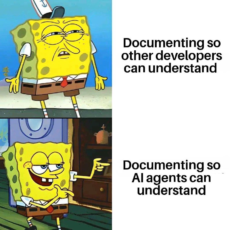 Мем "Documenting so AI agents can understand" с двумя панелями, где Губка Боб Квадратные Штаны выражает различные эмоции. На верхней панели он выглядит недовольным или скептическим, а рядом с ним текст: "Documenting so other developers can understand" (Документирование, чтобы другие разработчики могли понять). На нижней панели Губка Боб выглядит довольным и уверенным, указывая пальцами, а рядом с ним текст: "Documenting so AI agents can understand" (Документирование, чтобы агенты ИИ могли понять). Мем подчеркивает изменение приоритетов в документировании кода, показывая, что некоторые разработчики предпочитают писать документацию для ИИ, а не для коллег. Это может быть связано с тем, что ИИ становится все более важным инструментом в разработке, или с тем, что написание документации для людей часто воспринимается как нудная задача.