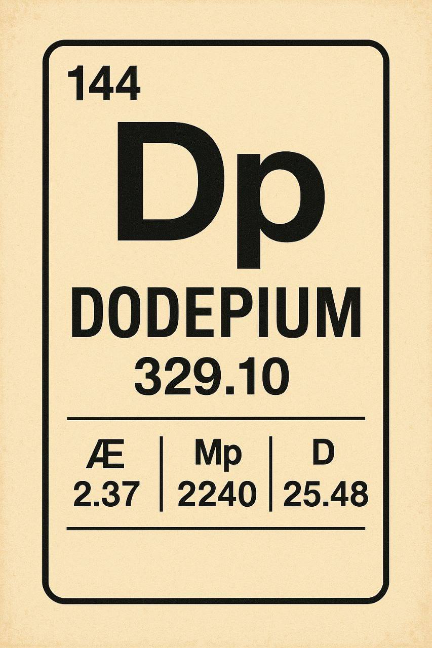 На изображении представлена стилизованная карточка химического элемента из периодической таблицы. Элемент вымышленный и называется "Dodepium" с символом "Dp". Под его названием указан атомный вес "329.10". Также на карточке присутствуют числа "144", "2.37", "2240" и "25.48", которые обозначают различные характеристики элемента, стилизованные под реальные данные, такие как плотность или температура плавления. Все надписи выполнены черным цветом на фоне, имитирующем старую бумагу.
