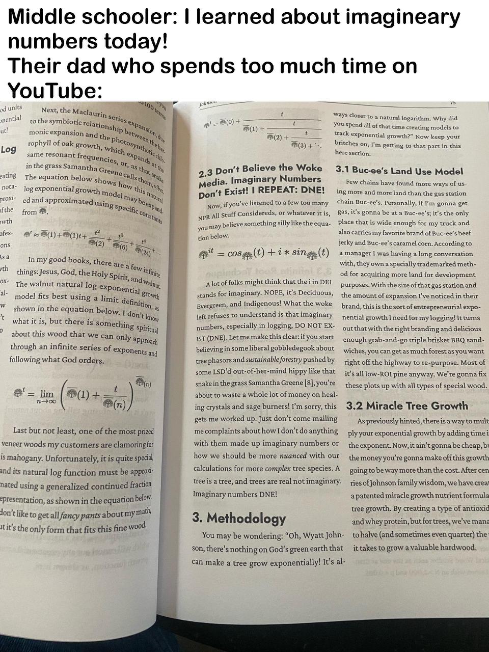 Мем состоит из двух частей: сверху подпись "Middle schooler: I learned about imaginary numbers today! Their dad who spends too much time on YouTube:" (Школьник средней школы: Сегодня я узнал о мнимых числах! Их папа, который проводит слишком много времени на YouTube:), а снизу фотография разворота книги, где текст одного из разделов главы 2 называется "2.3 Don't Believe the Woke Media. Imaginary Numbers Don't Exist! I REPEAT: DNE!" (2.3 Не верьте "проснувшимся" СМИ. Мнимых чисел не существует! ПОВТОРЯЮ: DNE!). Этот мем высмеивает отцов, которые увлекаются конспирологическими теориями и "альтернативными фактами", которые они находят на YouTube, игнорируя общепринятые научные знания. Раздел книги утверждает, что "мнимые числа не существуют", что противоречит основам математики, которые изучает школьник.