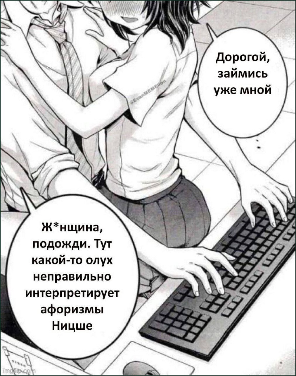 На изображении показана манга-панель в черно-белых тонах, где девушка прижимается к мужчине, пытаясь привлечь его внимание. Мужчина, вероятно, сидит за компьютером, так как его руки лежат на клавиатуре. Девушка смущенно прижимается к его спине и плечу, а её рука обнимает его. В правом верхнем углу находится текстовый пузырь с фразой «Дорогой, займись уже мной», выражающей её желание. В ответ, мужчина, не отрываясь от клавиатуры, отвечает ей в другом текстовом пузыре: «Женщина, подожди. Тут какой-то олух неправильно интерпретирует афоризмы Ницше». Это подчёркивает его увлечённость онлайн-спором или работой, игнорируя попытки девушки привлечь его внимание.