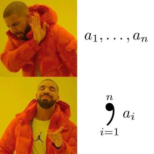 На картинке изображен популярный мем с Дрейком, разделенный на две части. В верхней части Дрейк, одетый в оранжевую куртку, отмахивается рукой, выражая неодобрение. Рядом с ним текст "a1, ..., an", что является математическим обозначением последовательности или ряда элементов. В нижней части Дрейк удовлетворенно улыбается, сложив руки в одобряющем жесте. Рядом с ним находится математическое обозначение суммы "∑ ai", где i=1 до n, что также представляет собой сумму элементов ряда. Этот мем используется для сравнения двух способов записи математических выражений, показывая предпочтение более компактного и общепринятого символа суммы перед перечислением элементов. Мем демонстрирует, как в математике часто предпочитают краткие и стандартизированные обозначения, такие как сумма (∑), вместо длинных перечислений. Таким образом, он высмеивает тех, кто использует менее эффективные или более громоздкие способы записи, когда есть более элегантные решения. Это может быть забавно для студентов и преподавателей математики, которые сталкиваются с подобными ситуациями в своей работе.