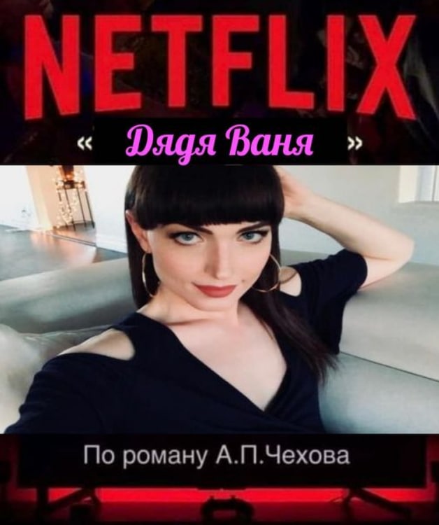 На картинке изображен мем с логотипом Netflix красного цвета на черном фоне, под ним фиолетовым цветом написано название «Дядя Ваня», заключенное в кавычки. Ниже расположена фотография девушки с темными волосами и челкой, одетой в черную кофту с вырезами на плечах и золотыми серьгами-кольцами, она сидит на светлом диване. Ее взгляд направлен прямо на зрителя. В самом низу картинки, на черном фоне с красной подсветкой, находится надпись белыми буквами: «По роману А.П. Чехова». Этот мем высмеивает тот факт, что Netflix снимает фильмы по классическим произведениям, но часто меняет пол персонажей или расу, из-за чего фильмы получаются очень странными и не соответствуют оригиналу.