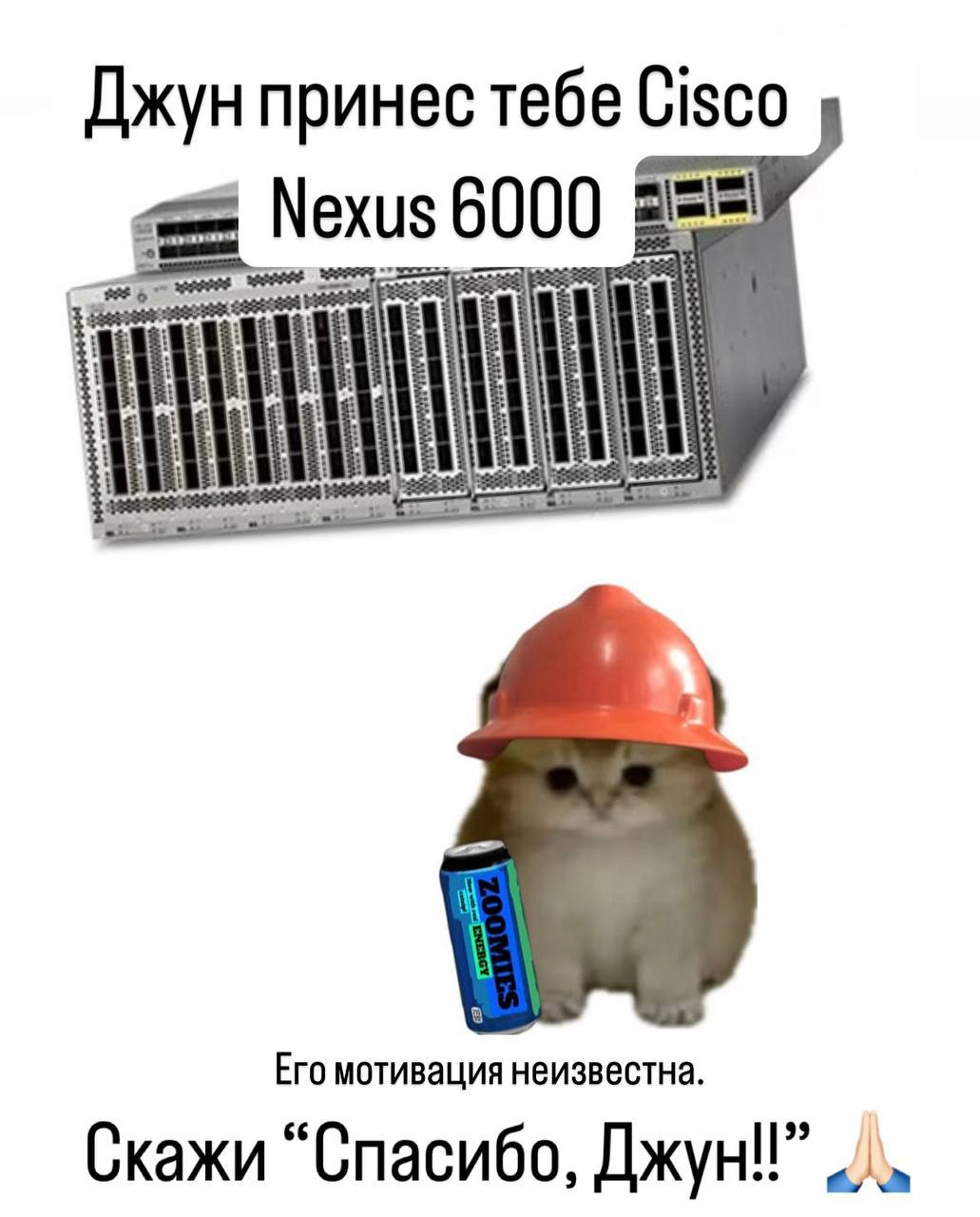 Мем изображает милого пушистого котенка, который сидит в строительной каске оранжевого цвета. Рядом с ним стоит синяя банка энергетического напитка под названием Zoomies. Над котенком и банкой энергетического напитка изображен большой коммутатор Cisco Nexus 6000. Весь фон изображения чисто белый. Текст на меме гласит: "Джун принес тебе Cisco Nexus 6000. Его мотивация неизвестна. Скажи "Спасибо, Джун!!"". Это означает, что джуниор-специалист (джун) принес дорогостоящее оборудование, и его мотивы остаются загадкой. Пользователю предлагается поблагодарить его.