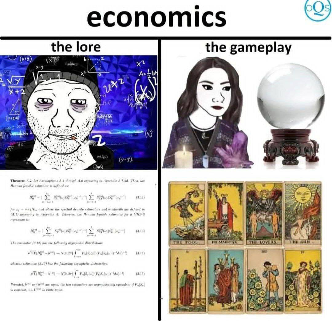 Мем под названием "Экономика: история vs игровой процесс" разделен на две части. Левая часть, обозначенная "the lore" (история/теория), показывает изможденного персонажа в шапке, похожего на "wojak", с сигаретой в зубах, на фоне доски, исписанной сложными математическими формулами и уравнениями. Под ним находится текст академического исследования с еще большим количеством формул. Правая часть, обозначенная "the gameplay" (игровой процесс/практика), изображает девушку с длинными темными волосами, одетую как гадалка, с горящей свечой, держащую в руках что-то похожее на фиолетовый кристалл. Рядом с ней стоит хрустальный шар на деревянной подставке. Ниже расположены несколько карт Таро с такими названиями, как "Шут", "Маг", "Влюбленные" и "Солнце", что символизирует использование интуиции и предсказаний в реальной экономике, в отличие от строгих научных методов. Эта картинка иронично сравнивает сложную теоретическую базу экономики с ее зачастую непредсказуемой и интуитивной практической стороной.