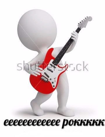 На изображении представлен 3D-рендер белого человечка, стоящего и играющего на красной электрогитаре. У человечка большая круглая голова без каких-либо черт лица, руки и ноги схематично обозначены. На гитаре видны струны и звукосниматели. В нижней части изображения находится надпись большими черными буквами: «Еееееееееее роккккк». Изображение выглядит забавным и может использоваться для передачи эмоций радости, веселья или любви к року.
