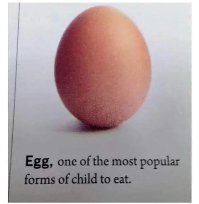 На изображении показано куриное яйцо на белом или светло-сером фоне. Ниже под ним находится подпись на английском языке, которая описывает яйцо как одну из самых популярных форм «ребенка» для употребления в пищу. Очевидно, что это либо опечатка, либо крайне неудачная формулировка в учебнике или энциклопедии, поскольку она создает юмористический и немного тревожный контраст между безобидным продуктом и понятием каннибализма. Это делает мем забавным и вирусным.