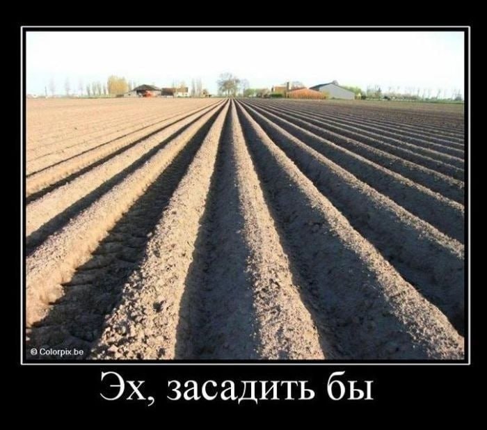 На изображении показано вспаханное поле, готовое к посадке. Длинные, ровные ряды земли тянутся вдаль, создавая ощущение простора и потенциала. Вдали видны несколько небольших зданий, возможно, фермерских, и несколько деревьев. Небо над полем светлое и чистое, что указывает на хорошую погоду для сельскохозяйственных работ. Внизу изображения присутствует подпись "Эх, засадить бы", что наводит на мысль о желании что-то посадить или начать новый проект. Эта фраза может быть истолкована как в прямом смысле (посадить урожай), так и в переносном, подразумевая начало какого-либо дела или процесса.