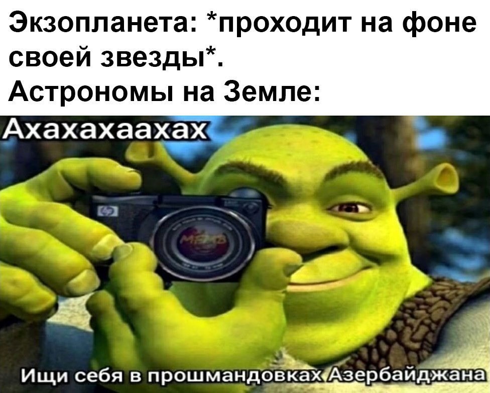Мем изображает Шрека, который держит фотоаппарат и ухмыляется, будто делает снимок. Надпись сверху гласит: "Экзопланета: *проходит на фоне своей звезды*. Астрономы на Земле: Ахахахаахах Ищи себя в прошмандовках Азербайджана". Это отсылает к ситуации, когда астрономы обнаруживают экзопланету, проходящую перед своей звездой, и используют этот момент для шутки, предлагая планете "искать себя в прошмандовках Азербайджана", что является популярной фразой в рунете. Мем обыгрывает юмор, связанный с астрономическими наблюдениями и современным интернет-сленгом, создавая комический контраст между серьезностью научного открытия и легкомысленностью фразы. Шрек с фотоаппаратом символизирует "фиксацию" этого момента, а его ухмылка подчеркивает ироничность ситуации. Фраза "Ищи себя в прошмандовках Азербайджана" в данном контексте используется как забавное и абсурдное выражение, не имеющее буквального смысла, но вызывающее смех.