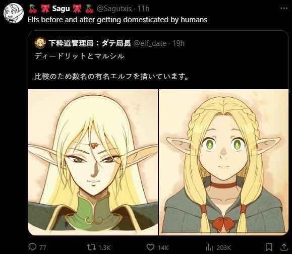 На изображении показан скриншот поста из Твиттера, в котором сравниваются два изображения эльфиек. В посте говорится «Эльфы до и после одомашнивания людьми». На левой стороне изображена эльфийка с длинными светлыми волосами, острыми ушами и пронзительным взглядом, напоминающая классического лесного эльфа. На правой стороне эльфийка выглядит более милой и невинной, с косичками и ошейником, что символизирует ее «одомашнивание» или приспособление к человеческому обществу. Этот мем высмеивает идею о том, как дикие существа могут измениться, адаптируясь к жизни рядом с людьми, становясь более «ручными» и менее угрожающими. Левая эльфийка выглядит как суровый воин, а правая — как компаньон или даже домашнее животное. Это можно интерпретировать как шутку над тем, как фэнтезийные расы теряют свою «дикость» в поп-культуре, становясь более милыми и человечными, или как сатиру на то, как люди приспосабливают природу под свои нужды.