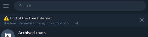 На изображении показан скриншот экрана мобильного приложения или веб-сайта с предупреждением «End of the Free Internet» (Конец свободного интернета). Под ним находится более детальное объяснение: «The free internet is turning into a tool of control» (Свободный интернет превращается в инструмент контроля). На скриншоте также видны элементы интерфейса, такие как поле поиска, иконка меню-гамбургера и заголовок «Archived chats» (Архивированные чаты) ниже предупреждения. В правом верхнем углу окна уведомления есть кнопка закрытия в виде крестика. Всё это изображено на тёмном фоне, что создаёт мрачную и тревожную атмосферу сообщения о возможном конце свободного интернета.