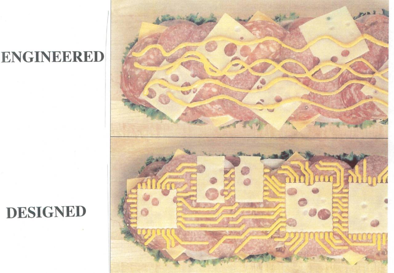 На изображении показаны два варианта одного и того же бутерброда, демонстрирующие разницу между понятиями «спроектировано» и «разработано». В верхней части картинки, подписанной «Engineered» (Спроектировано), мы видим бутерброд, где ломтики сыра и колбасы расположены относительно хаотично, а горчица нанесена волнистыми линиями. Это символизирует общую идею, прототип или менее детализированную версию. Нижняя часть, подписанная «Designed» (Разработано), показывает тот же бутерброд, но с гораздо более упорядоченной структурой. Ломтики сыра с дырками расположены в виде микросхем, а горчица аккуратно нанесена, имитируя дорожки печатной платы, соединяющие эти «чипы». Это изображение наглядно иллюстрирует, как детализация и тщательная проработка превращают общую концепцию в готовый продукт, будто его дизайн продумывал настоящий инженер.