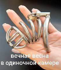 На изображении женская рука держит два металлических устройства, напоминающих по форме браслеты или ошейники. Одно из них круглое, с пересекающимися стержнями, другое — более вытянутое, спиралевидное, с замком на конце. Оба устройства блестящие, хромированные. Фон размыт, что акцентирует внимание на руке и предметах. Надпись на изображении "вечная весна в одиночной камере" добавляет ироничный и мрачный подтекст к изображению этих предметов, которые, вероятно, являются приспособлениями для контроля или лишения свободы. Вечная весна в одиночной камере символизирует парадоксальное сочетание прекрасного времени года и тюремного заключения, усиливая ощущение безысходности и несвободы.