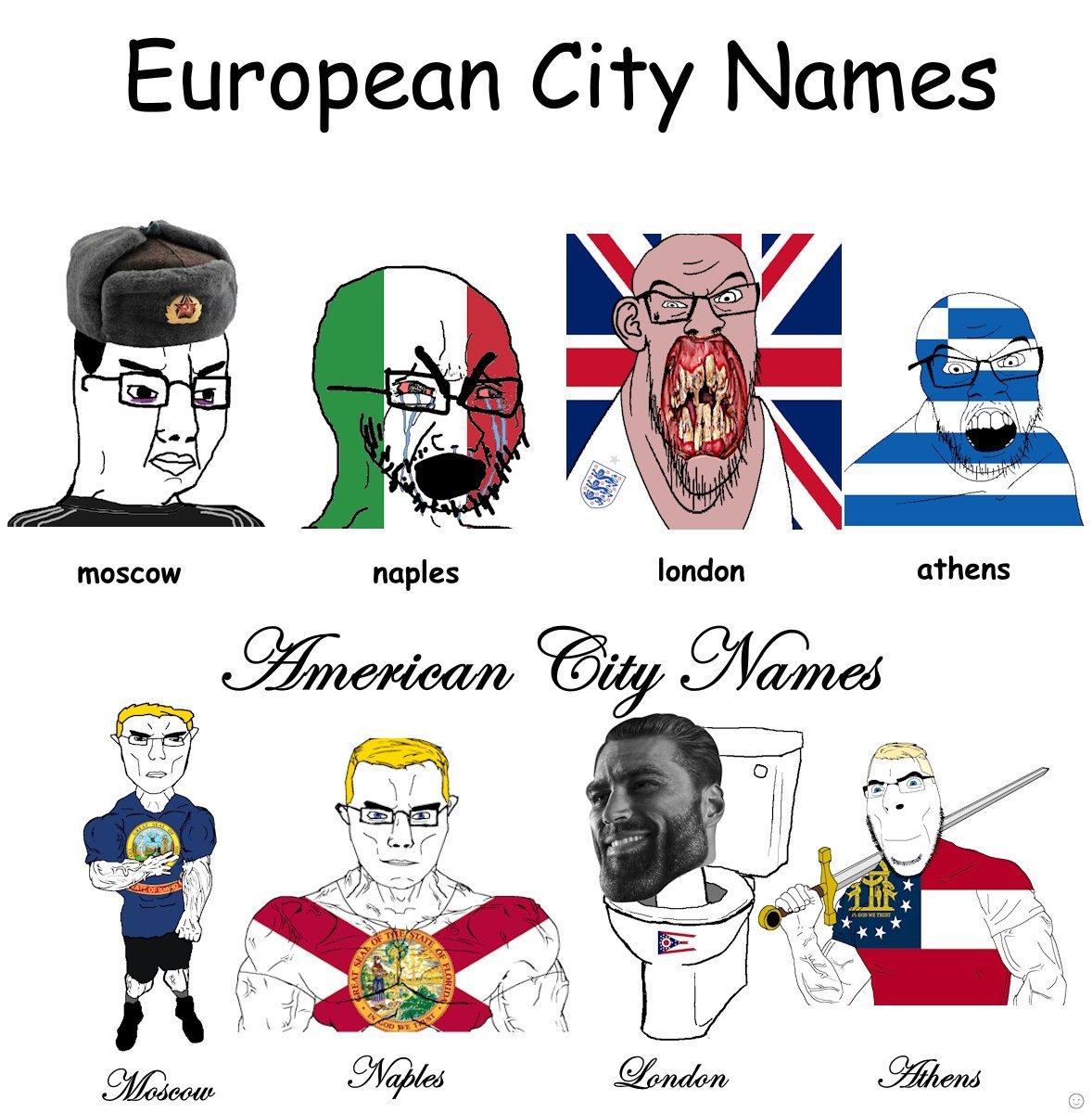 Мем "Названия европейских и американских городов" демонстрирует контраст между восприятием европейских и американских городов с одинаковыми названиями. В верхней части показаны четыре персонажа wojak/soyjak, олицетворяющие европейские города: Москва, Неаполь, Лондон и Афины. Каждый персонаж имеет черты, стереотипно связанные с соответствующей страной. Например, "Москва" изображена в ушанке, "Неаполь" в цветах итальянского флага, "Лондон" в цветах британского флага с ужасными зубами, а "Афины" в цветах греческого флага. Все они выглядят довольно непривлекательно, а двое из них даже в состоянии "кряхтения сойджека" (soyjak-face-clench-grunt). В нижней части представлены американские города с теми же названиями, изображенные как брутальные качки. Американская "Москва" изображена в футболке с гербом штата Флорида, "Неаполь" одет в цвета флага Флориды, "Лондон" — это голова Гигачада (Gigachad) в унитазе с флагом Огайо, а "Афины" — мускулистый мужчина с мечом, одетый в флаг Джорджии. Этот мем играет на стереотипах и показывает, как одно и то же название может вызывать совершенно разные ассоциации в зависимости от континента.