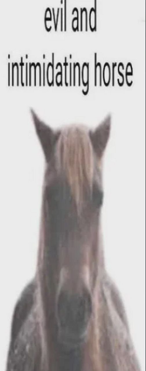 На изображении представлен мем с надписью «evil and intimidating horse», что переводится как «злая и пугающая лошадь». Сама картинка показывает голову лошади, снятую крупным планом спереди, на белом фоне. Лицо животного выглядит несколько размытым, возможно, из-за ракурса или качества снимка. Выражение морды лошади, на удивление, спокойное, даже милое, что создает юмористический контраст с грозной подписью. Мех лошади имеет коричневые и серые оттенки, грива того же цвета.