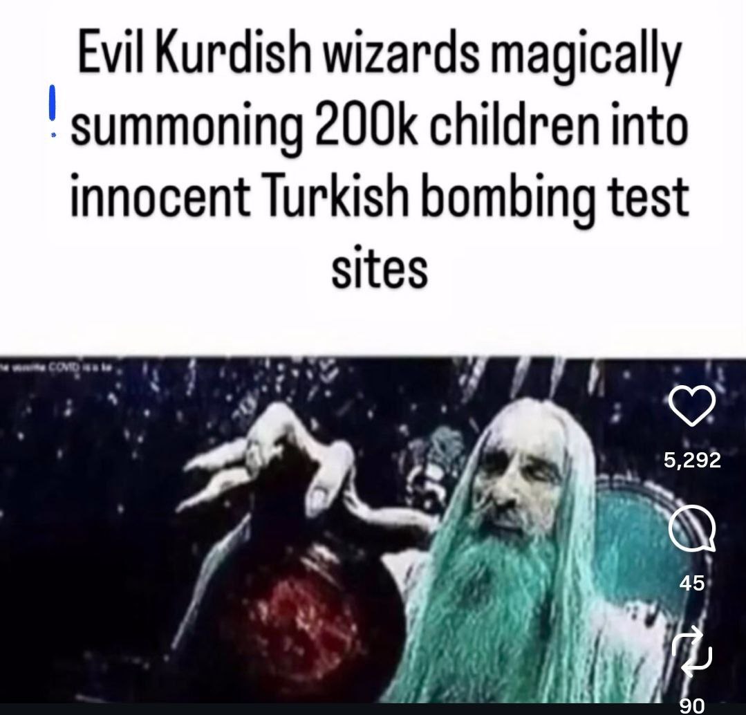 На изображении представлен мем, состоящий из двух частей. В верхней части находится текст на английском языке, а в нижней части — изображение, предположительно, волшебника или мага. Текст сверху гласит: "Evil Kurdish wizards magically summoning 200k children into innocent Turkish bombing test sites", что переводится как «Злые курдские волшебники магически призывают 200 тысяч детей на невинные турецкие полигоны для бомбардировок». Под текстом изображен старик с длинной бородой и волосами бирюзового цвета, сидящий на троне и держащий в руке какой-то предмет, похожий на сосуд с красной жидкостью внутри. Изображение стилизовано под старую живопись или кадр из фильма. Мем высмеивает ироничное представление о том, как одна сторона конфликта может изображать другую сторону как абсолютно "злую" и приписывать ей нелепые, невозможные действия, чтобы оправдать свои собственные действия.