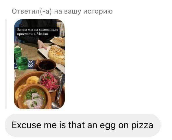 Ответил(-а) на вашу историю. Зачем мы на самом деле приехали в Милан. Excuse me is that an egg on pizza.