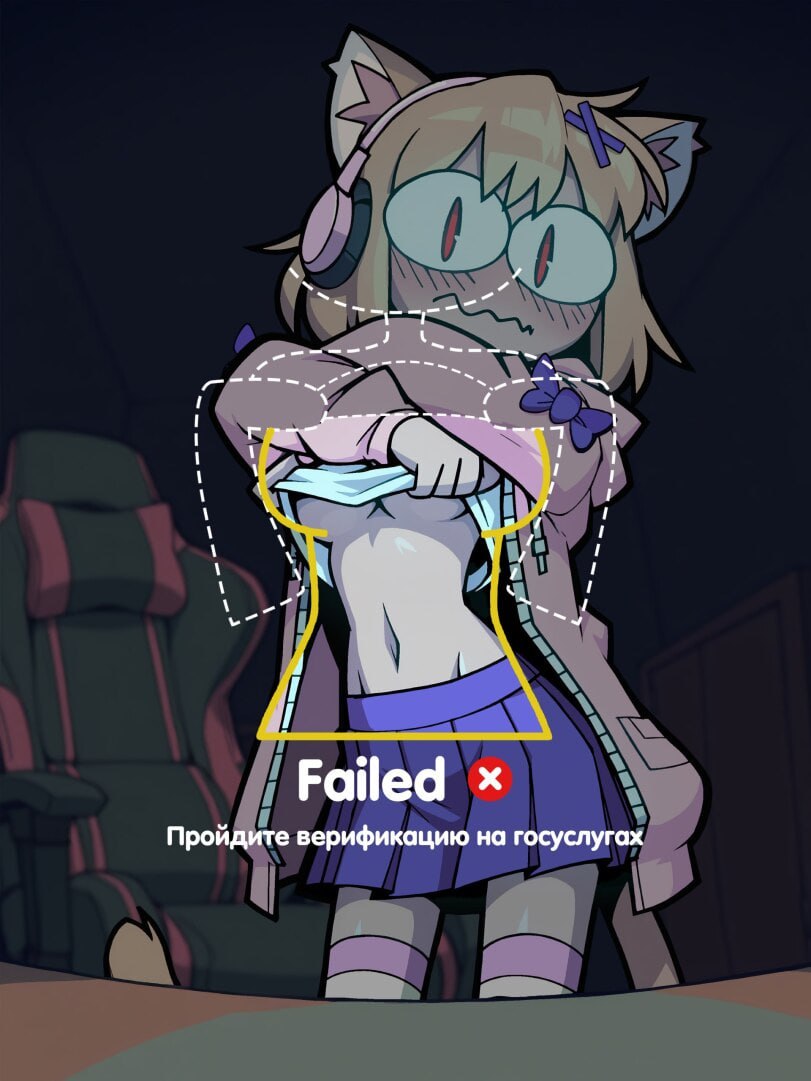 На изображении показана кошкодевочка с наушниками на голове, которая явно смущена и пытается приподнять свою кофту, чтобы показать пресс. Над ней пунктирными линиями показаны формы, к которым она стремится, но жёлтой линией обведена её реальная фигура, которая значительно отличается от желаемой. Внизу изображения красным крестиком показано, что попытка "провалена" (failed). Внизу находится надпись на русском языке, которая гласит "Пройдите верификацию на госуслугах". Это отсылка к проверке возраста или других данных, что добавляет юмористический смысл к ситуации с неудачной попыткой девушки. Возможно, это попытка показать, что для достижения идеальной фигуры нужно пройти какие-то "проверки" или усилия, или же это просто забавная игра слов с намёком на бюрократию.
