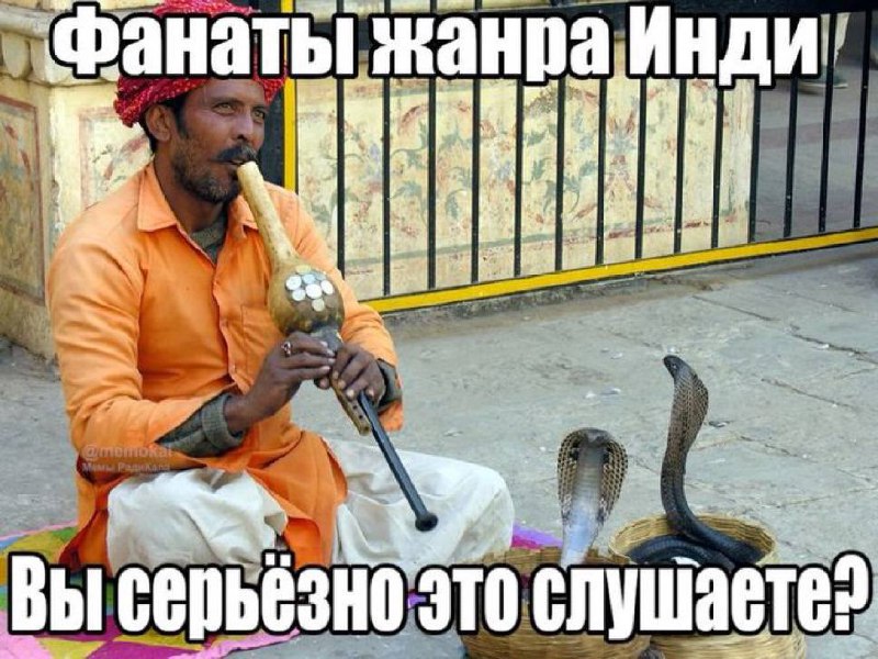 На изображении показан заклинатель змей, сидящий на земле, играющий на дудочке, сделанной из тыквы. Перед ним две кобры, поднявшие свои головы из корзин, как будто они танцуют под музыку. Над заклинателем и кобрами находится надпись: "Фанат жанра Инди", а под ними - "Вы серьезно это слушаете?". Это высмеивает специфические музыкальные жанры, которые могут быть непонятны или даже неприятны для широкой аудитории. Мем выражает недоумение по поводу того, как люди могут наслаждаться такой музыкой, сравнивая ее с игрой на дудочке для змей, что является метафорой для чего-то странного или экзотического.