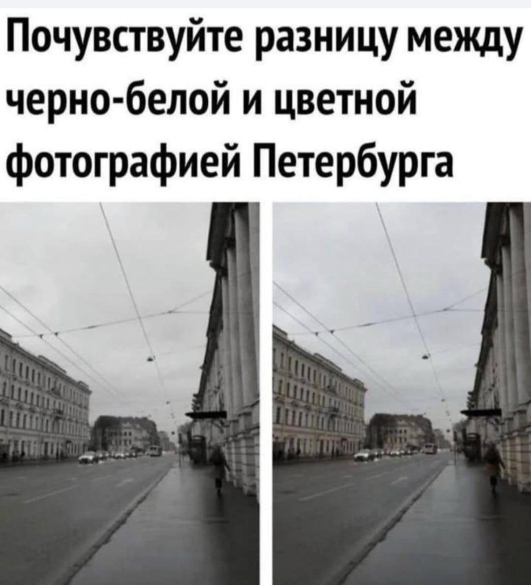 На изображении представлен коллаж из двух фотографий города Санкт-Петербурга, расположенных рядом друг с другом. Обе фотографии практически идентичны и показывают одну и ту же улицу с жилыми зданиями, автомобилями и троллейбусными проводами на фоне пасмурного неба. Разница между ними, как следует из надписи «Почувствуйте разницу между черно-белой и цветной фотографией Петербурга», должна быть в цветовой гамме, но обе фотографии на самом деле выглядят монохромными или очень блеклыми, что создает комический эффект. Мем обыгрывает стереотипное представление о Петербурге как о мрачном, сером городе с частыми дождями и облачной погодой, где даже цветные фотографии выглядят почти как черно-белые. Он также намекает на невозможность заметить разницу, подчеркивая унылую атмосферу города.