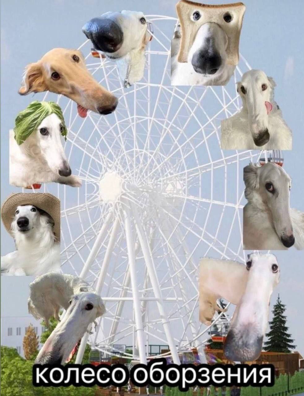 На изображении представлено колесо обозрения, на месте кабинок которого расположены головы борзых собак, каждая из которых имеет свой уникальный и забавный вид. Некоторые собаки одеты в шляпы, другие — в листья салата, а одна голова борзой даже имеет на себе кусок хлеба, имитирующий глаза. Внизу изображения присутствует надпись «колесо оборзения», которая является каламбуром на русское название колеса обозрения, дословно «колесо обзора». Этот мем играет на схожести слов и создает комический эффект, объединяя величественных собак породы борзая с обыденным аттракционом, придавая ему новый, смешной смысл. Разнообразие выражений и аксессуаров на головах собак добавляет изображению еще больше юмора.