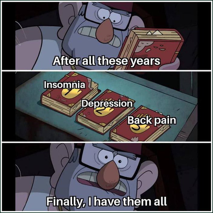 Мем основан на кадре из мультсериала «Гравити Фолз», где Стэнфорд Пайнс, держа в руках дневники, произносит фразу: «После всех этих лет. Наконец-то я собрал их все». В меме изображен Стэнфорд, который наконец-то собрал все свои «проблемы» — бессонницу, депрессию и боль в спине. Этот мем часто используют, чтобы выразить усталость от накопившихся жизненных проблем или показать, что человек достиг некой «коллекции» неприятных состояний. Особенно актуален для тех, кто ищет мемы про усталость или депрессию.