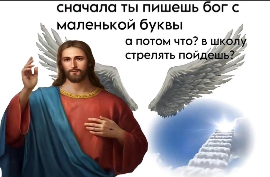 На меме изображен Иисус Христос с крыльями за спиной, стоящий на фоне чистого белого неба. Его правая рука поднята в благословляющем жесте, а левая прижата к груди. В верхней части изображения расположен текст, который читается как «сначала ты пишешь бог с маленькой буквы, а потом что? в школу стрелять пойдешь?». Этот текст указывает на эскалацию незначительного проступка до серьезного преступления, используя иронию и преувеличение. Иисус словно недоумевает от такого поведения, и это придает мему юмористический, но слегка поучительный характер. В нижней правой части изображения также видна лестница, уходящая в небо, что может символизировать путь к небесам или моральному совершенству.