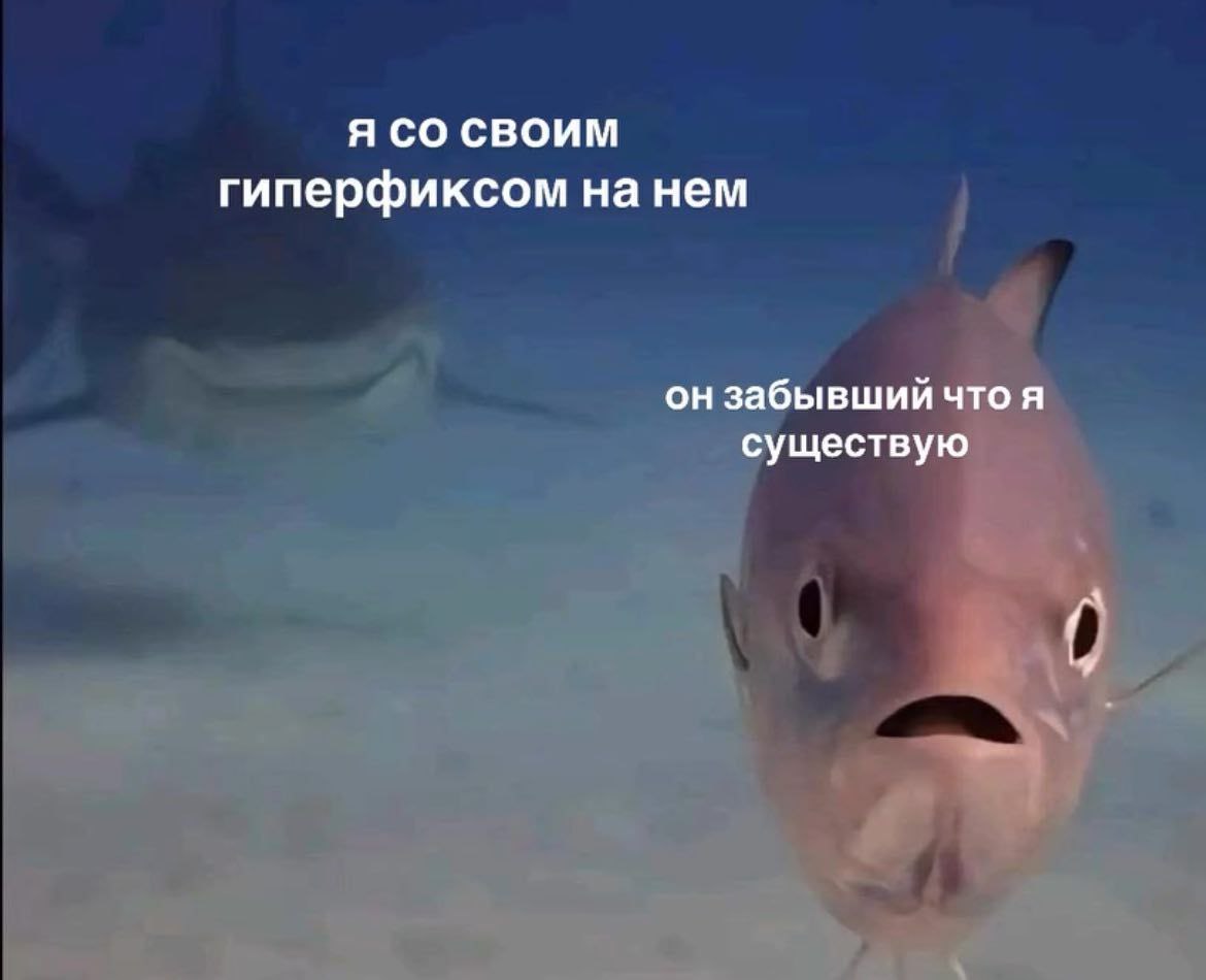 На картинке с мемом мы видим двух рыб под водой. На заднем плане, в темноте, видна большая акула, которая плывет за маленькой рыбкой. На переднем плане изображена маленькая рыбка с широко раскрытым ртом, выражающая удивление, испуг или замешательство. На акуле написано "я со своим гиперфиксом на нем", а на маленькой рыбке "он забывший что я существую". Это противопоставление подчеркивает разницу во внимании: один объект сосредоточен на другом, который, в свою очередь, совершенно забыл о его существовании. Это мем об одностороннем увлечении или внимании, где человек или его увлечение (гиперфиксация) преследует объект, который уже давно о нем забыл.