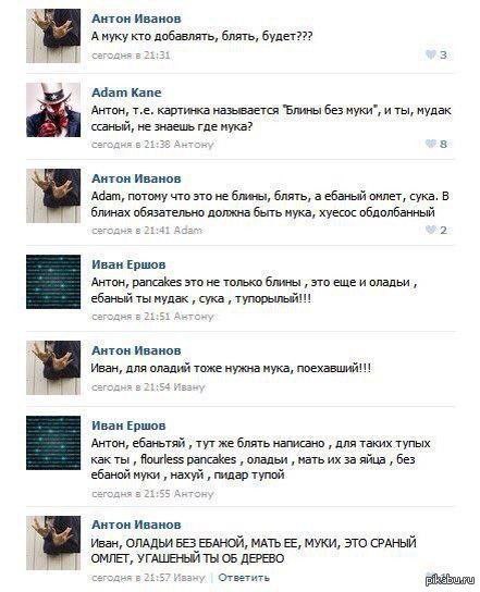 Мем представляет собой скриншот из русскоязычной социальной сети, где пользователи активно обсуждают рецепт "блинов без муки" (flourless pancakes). В центре дискуссии — Антон Иванов, который категорически отрицает возможность приготовления оладий или блинов без муки, считая это обычным омлетом. Другие пользователи, Адам Кейн и Иван Ершов, пытаются объяснить Антону, что существуют такие рецепты, где блины или оладьи готовятся без муки, например, используя яйца. Разговор быстро перерастает в эмоциональную перепалку с использованием нецензурной лексики, демонстрируя упорство каждого участника в своей точке зрения.