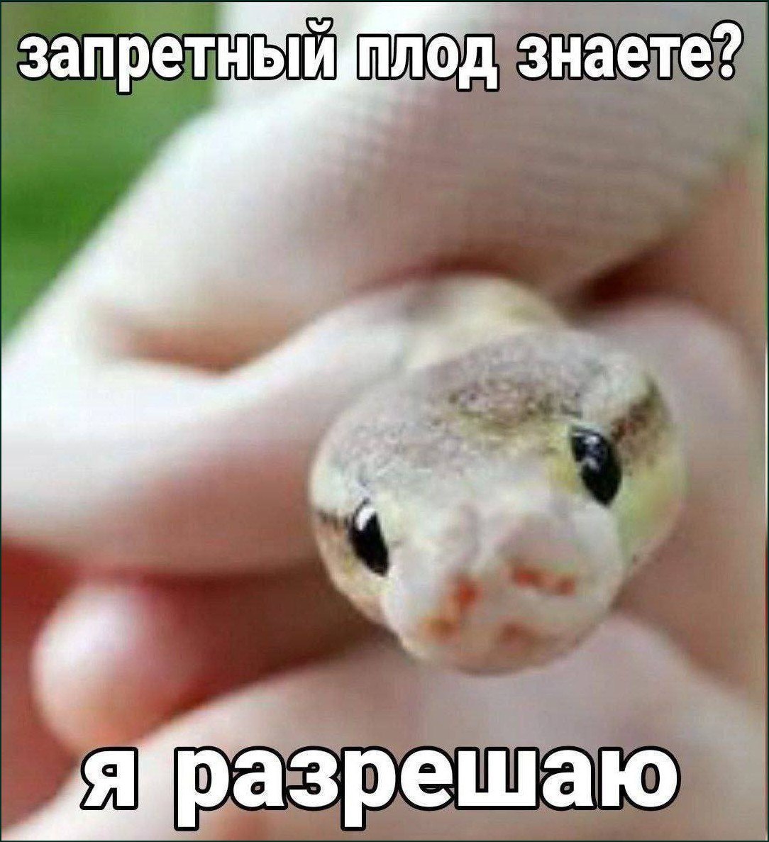 На изображении показана мордочка маленькой змеи, возможно питона. Змея смотрит прямо в камеру, ее глаза и ноздри четко видны. На заднем плане видны размытые человеческие пальцы, поддерживающие змею. Сверху и снизу наложен текст, который переводится как «запретный плод знаете? Я разрешаю». Это создает юмористический контраст, будто змея, ассоциирующаяся с искушением (как в библейской истории), дает разрешение на то, что обычно считается запретным.